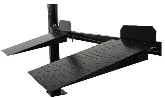 APlusLift HW-8SXLT 4-post car auto lift truck hoist package includes a caster kit with polyurethane wheels, a jack tray, three drip trays, two approach ramps, and a powercord. The caster kit allows customers to move the lift around the garage easily and can be installed or removed in minutes. The jack tray allows customers to use a jack to lift one end of the vehicle. The drip trays prevent fluid from the top vehicle from dripping onto the bottom vehicle. Optional sliding jacks are available for purchase.