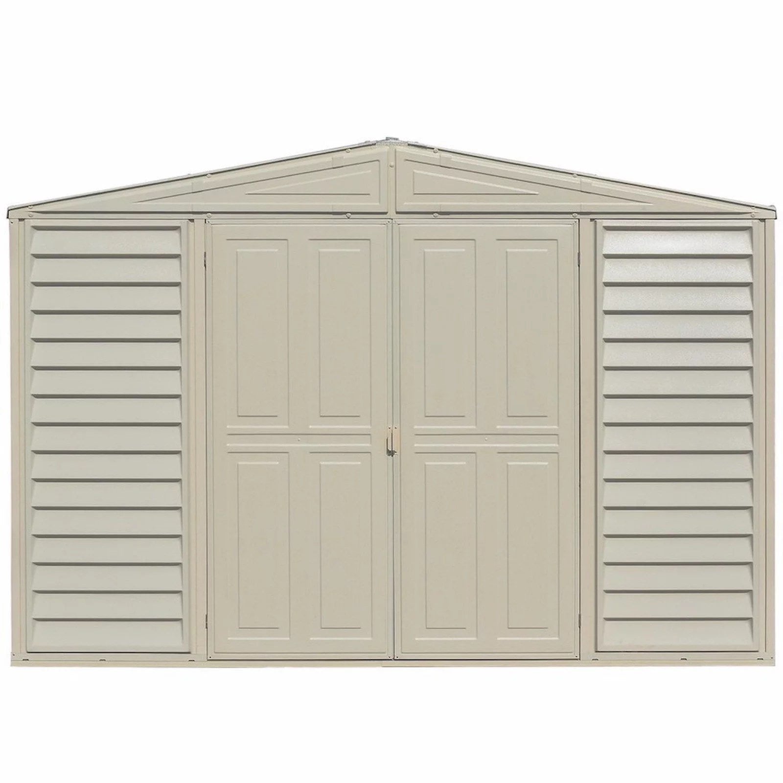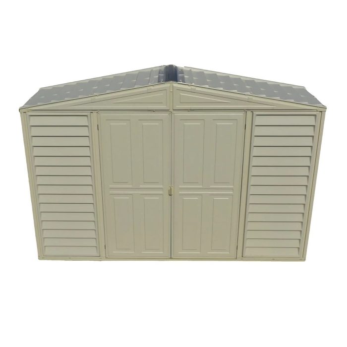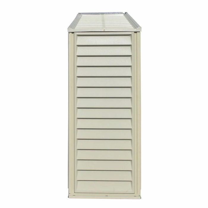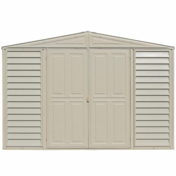 Part of the Woodbridge series, DuraMax Sheds now offers a new 10.5′ x 2.75′ vinyl shed for smaller storage needs. The new shed gives you the ultimate solution for storage in long slim areas! Shopping for a new shed can be tedious; there is no better value out there if you desire a real vinyl shed! This massive shed offers tall walk-in, extra wide double doors. Built with heavy duty wall columns with steel reinforcements to add superior strength, strong enough to hang garden tools on or build shelves with ease. This extra long shed provides a unique solution for odd spaces.