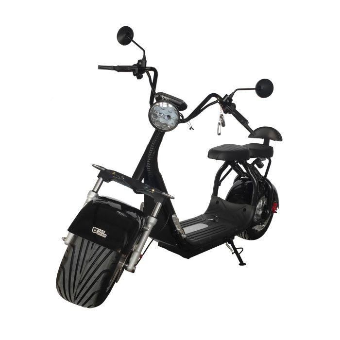 Fat Bear Fat City Electric Fat Tire Scooter by eDrift is A fun nimble recreation vehicle with front and rear suspension that glide over cobblestone streets. Keep the fun going with Fat City’s range of up to 28 miles between charges and a locked compartment for a spare battery.