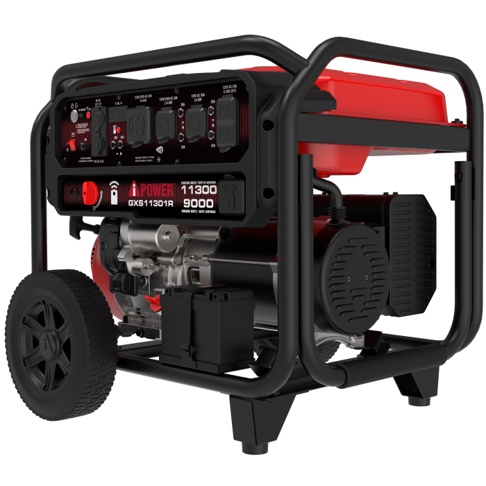 The A-iPower GXS11301R generator with a remote, with a performance series 459cc OHV engine, a cast iron sleeve, and low oil shutdown, has 11,300 starting watts and 9,000 running watts on gasoline. The 9.5-gallon fuel tank offers extended run time of up to 18 hours at 25% load. The unit is simple to starting, as it has recoil, electric, and remote start, with a fob and battery included.