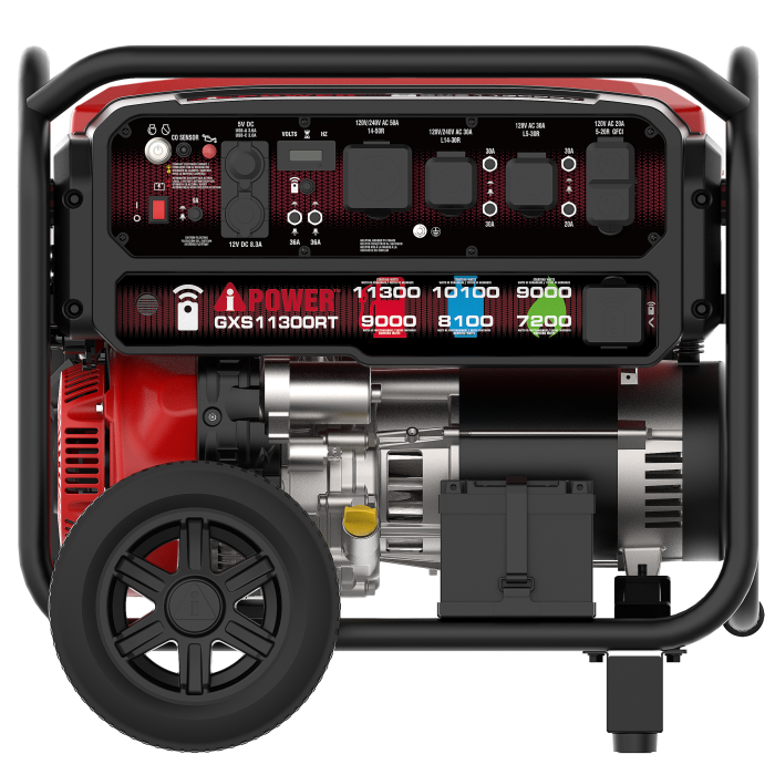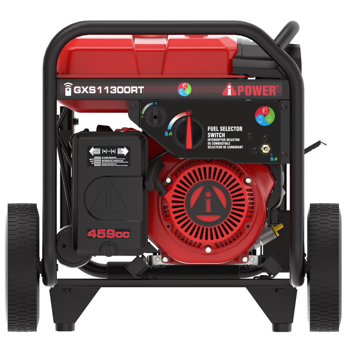Featuring a 459cc OHV engine with cast iron sleeve and low oil shutdown, the GXS11300RT Remote Tri-Power Portable Generator has 11,300 starting watts and 9,000 running watts on gasoline, 10,100 starting watts and 8,100 running watts on propane, and 9,000 starting watts and 7,200 running watts on NG. It offers simple starting through recoil, electric, and remote start, plus a battery and fob is included.