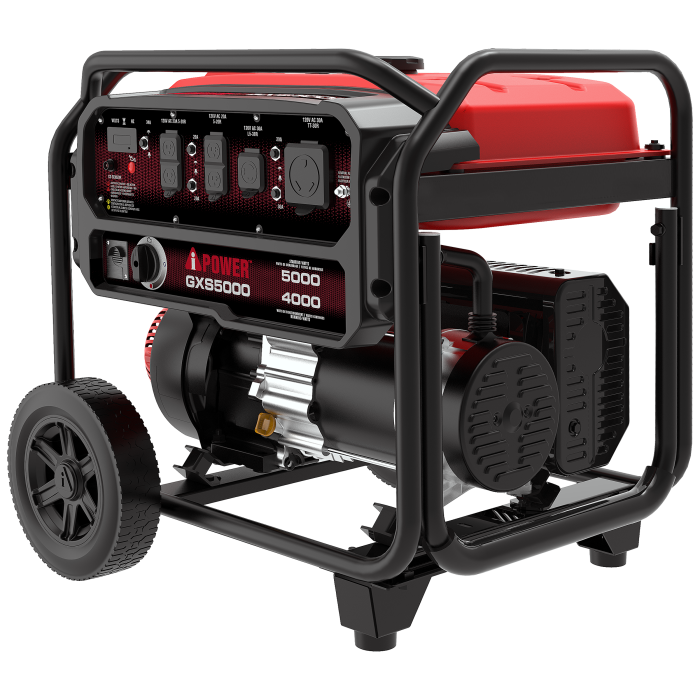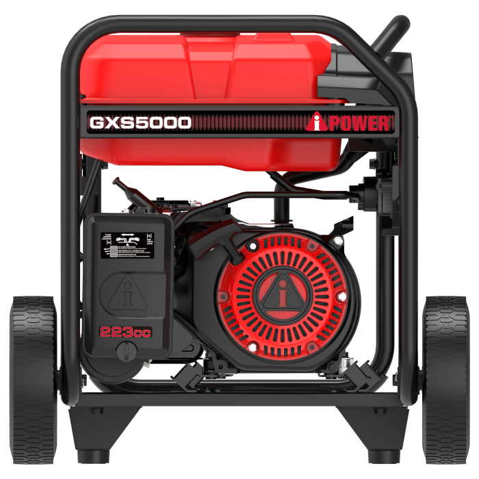 Featuring a 223cc OHV engine with cast iron sleeve and low oil shutdown, the GXS5000 Portable Generator has 5,000 starting watts and 4,000 running watts. The 6.3-gallon fuel tank provides an extended run time of up to 20 hours at 25% load.