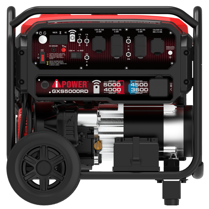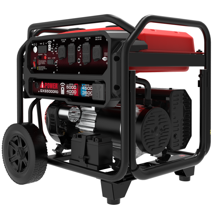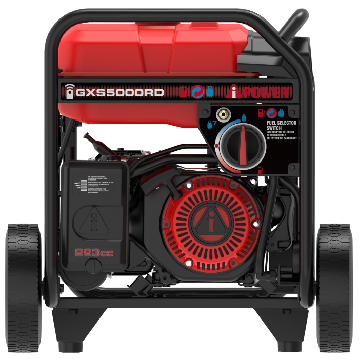 Featuring a 223cc OHV engine with cast iron sleeve and low oil shutdown, the GXS5000RD Remote Dual Fuel Portable Generator has 5,000 starting watts and 4,000 running watts on gasoline and 4,500 starting watts and 3,600 running watts on propane. It offers simple starting through recoil, electric, and remote start, plus a battery and fob is included.