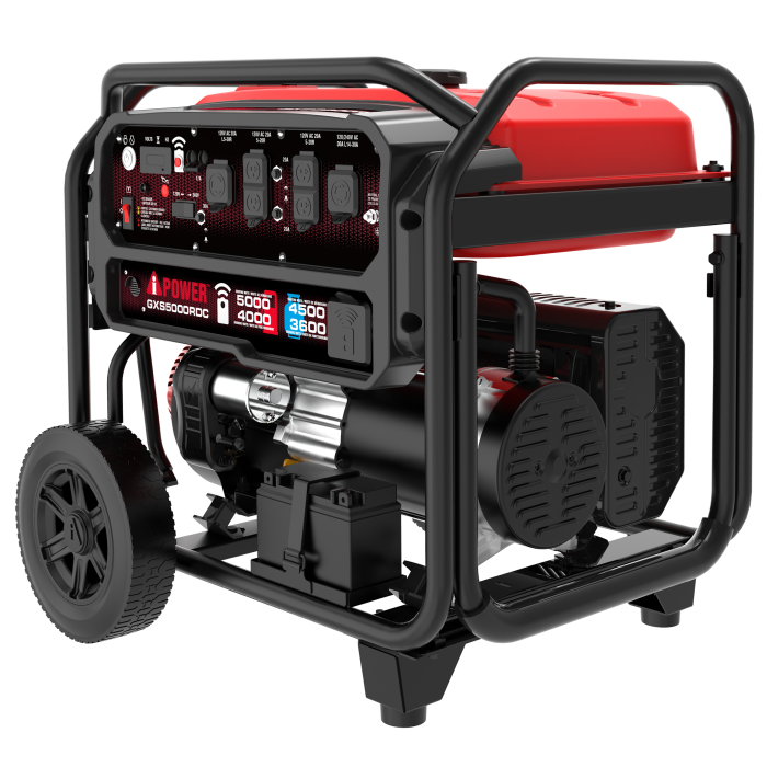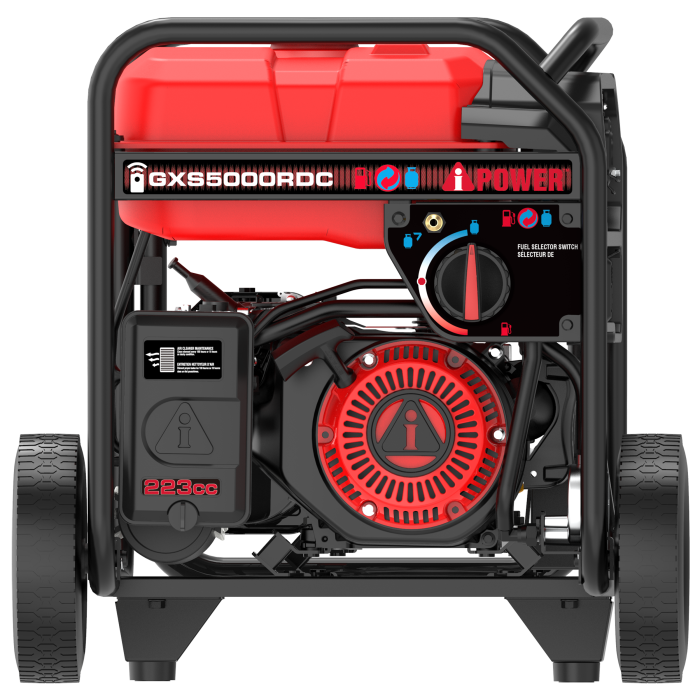Featuring a performance series 223cc OHV engine with a cast iron sleeve and low oil shutdown, the A-iPower GXS5000RDC Remote Dual Fuel Generator has 5,000 starting watts and 4,000 running watts on gasoline, with 4,500 starting watts and 3,600 running watts on propane. Built tough with a durable automotive-style finish, the 6.3-gallon fuel tank provides an extended run time of up to 20 hours at a 25% load.