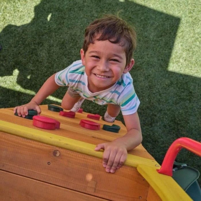Give your little cubs an extraordinary backyard experience to climb, swing, slide and imagine all day long with the Bear Cave Lodge Swing Set / Playset from KidKraft. Our largest swing set, it includes a clubhouse complete with door, kitchen, accessories and even a cafe window and bench! The second level offers up plenty of room for make believe play. Sliding down the double wave slides with a pal makes for friendly competition. Two rock ladders encourage extra exercise while the inviting tunnel is a fun way to crawl to the lookout tower for expanded adventures. There, kids will discover a telescope and twisty tunnel slide. For hands-on messes, let kids explore the sand/water station. Divided sections give kids individual spaces for ultimate creativity. So, set the moveable hands clock to “playtime” and let the excitement begin with the KidKraft Bear Cave Lodge Swing Set!