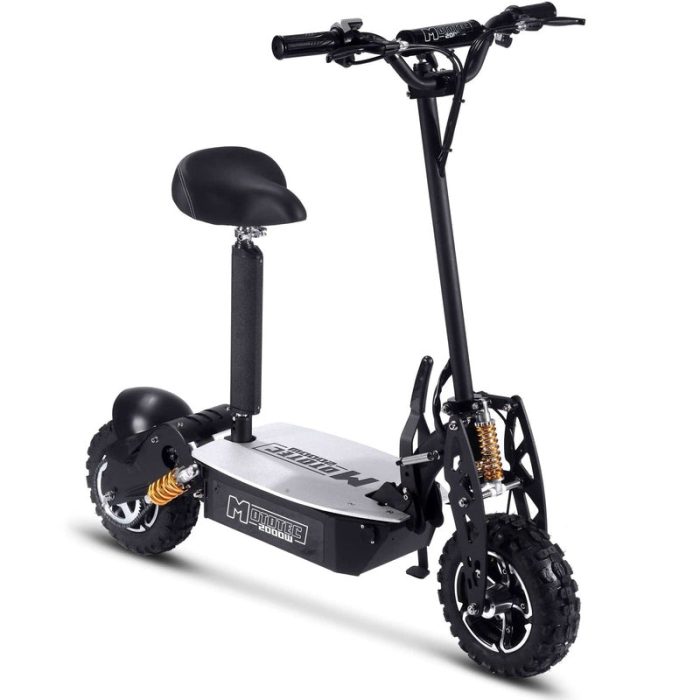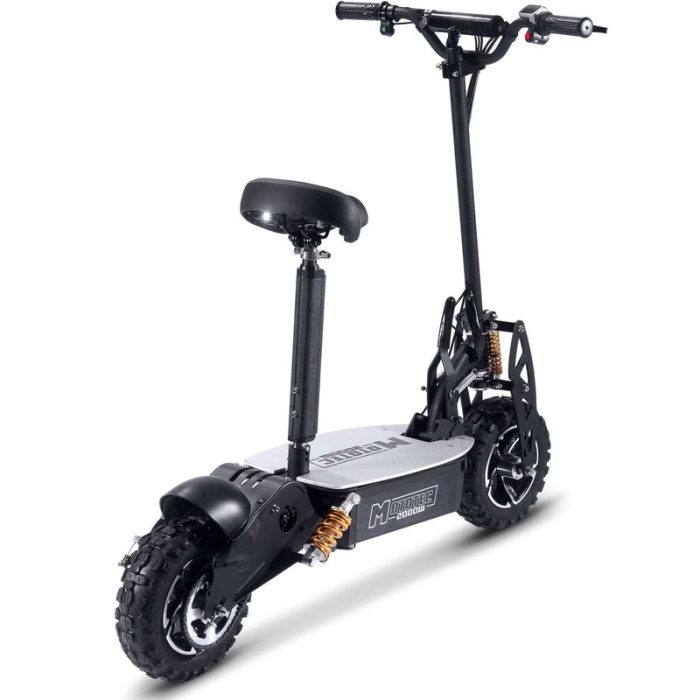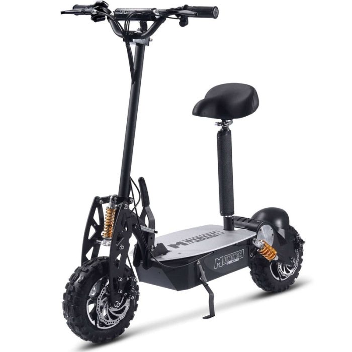 This scooter is the most powerful electric scooter we carry. Powered by 48 volts and a 2000 watt motor, there won’t be a hill you can’t conquer! Comes standard with a quick release seat, foldable locking frame, large 11 inch knobby onroad/offroad tires, key ignition and ecomony mode to conserve battery life for longer rides. This scooter does not disappoint!