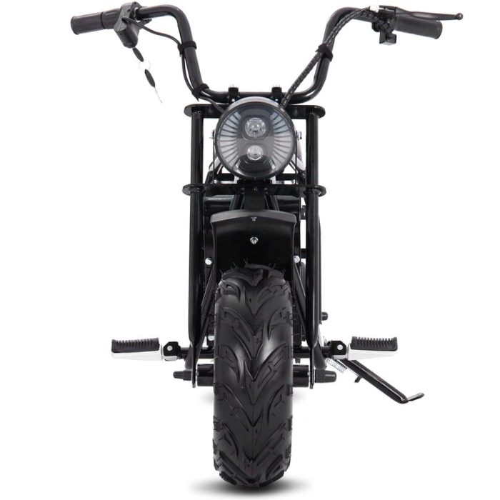 Just like the ones your parents used to drive, only safer and easier to use. Powered by a brushless 1000 watt electric motor and rugged chain drive. Large front headlight, key start and half twist throttle for safety. With its rugged steel frame and huge knobby tires, this mini bike is built tough to handle the roughest of terrain.