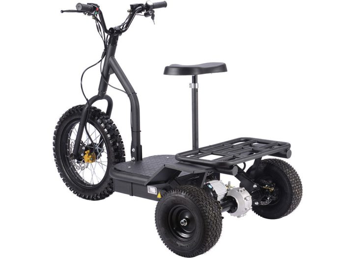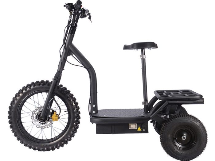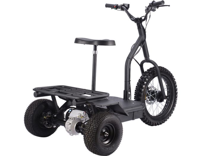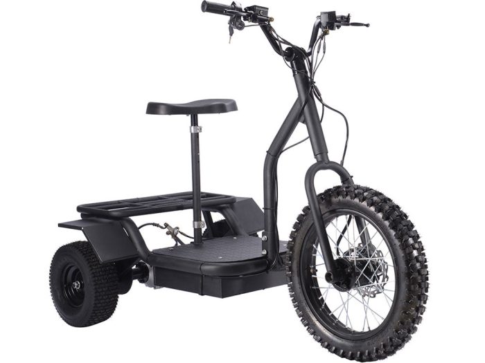 The New MotoTec 48v 1200w Electric Powered Trike is a torque monster ready to conquer any terrain! This is a three wheel electric scooter that you can ride while sitting or standing, this makes it very convenient for use at events, security and warehouse floor operations or for just plain fun! It’s like a three wheel Segway but at a fraction of the price! Powered by a 1200 watt servo motor with speeds up to 15 miles per hour. It can achieve a 20+ mile range on a full charge. It features a 24″ pneumatic front tire, two 5″ pneumatic rear tires and a removable seat. This personal transporter is easy-to-operate with a twist throttle and front/rear hydraulic brake system. Comes standard with key, battery meter lights, reverse and carrying rack.