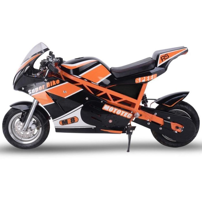 - This electric bike features a sporty pocket bike design with streamlined and reinforced frame with racing street tires. Enjoy excellent control and maneuverability with the hydraulic disc brakes and a full suspension setup.