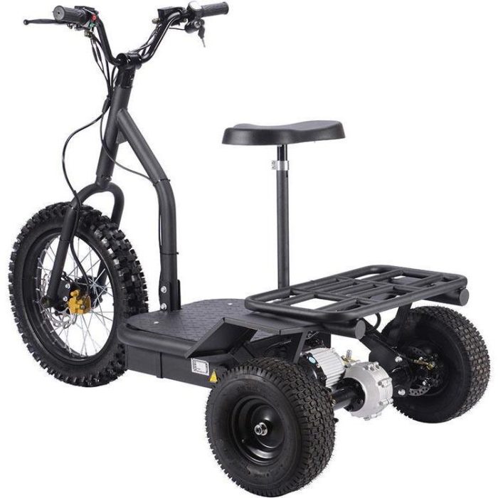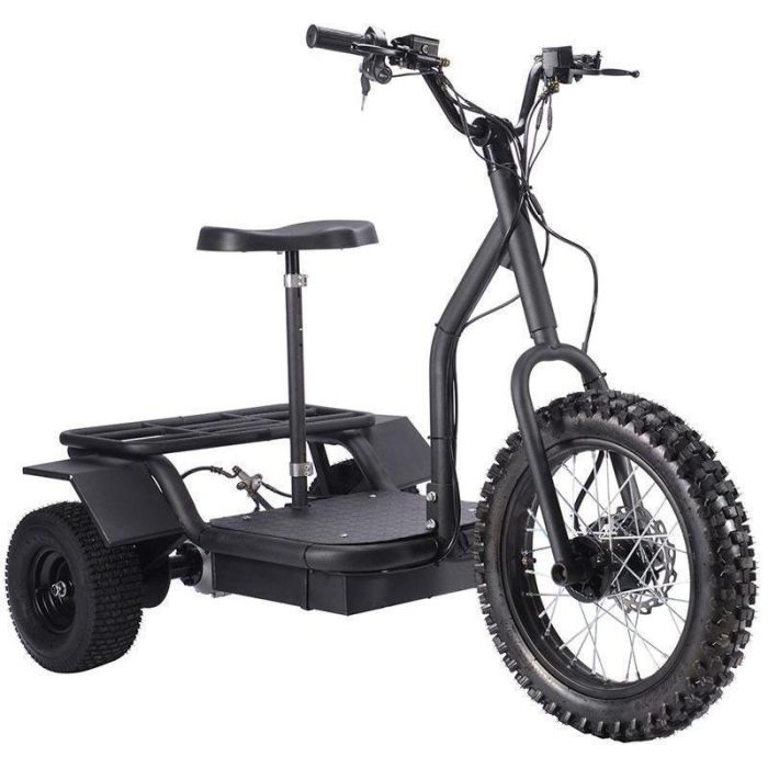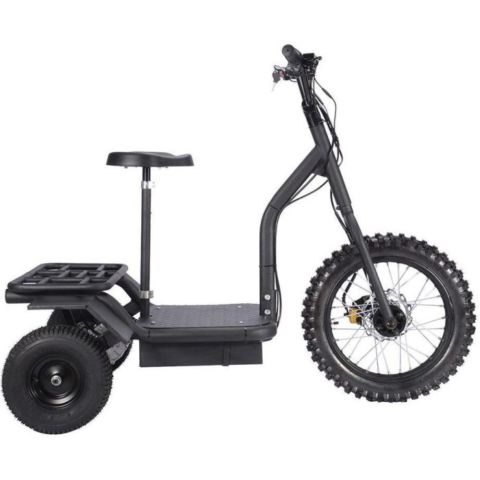 The MotoTec Transportation 3-Wheel Mobility Scooter has a throttle and hydraulic disc brakes so it accelerates and stops smoothly. The throttle is easy to use and allows you to zoom on the road. The scooter comes with a mini LCD readout. The scooter comes with 12-inch fat tires on the rear and a 24-inch tire on the front.