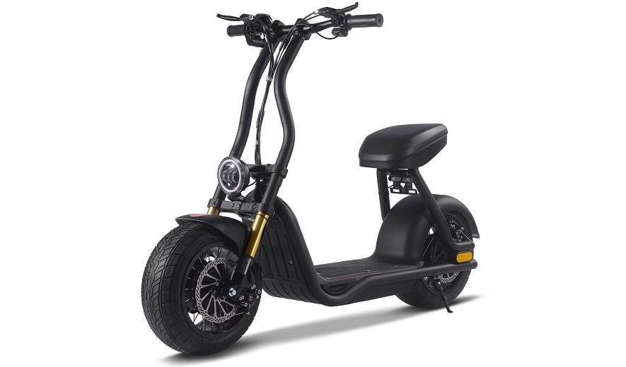 Introducing the new MotoTec Diablo 48v 1000w Lithium Electric Scooter – Black A  Powered Electric Fat Tire Scooter. Ergonomic shapes, large padded seat, LED headlight & brake light, front suspension with large street tires give this scooter a lot of attitude. Comes standard with front & rear disc brakes, key start and battery meter. This top of the line model features a rear hub motor with generous torque and performance, ready to tackle any terrain.