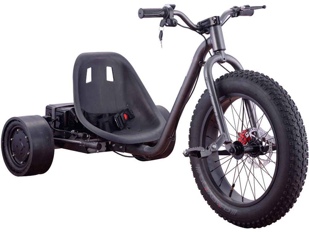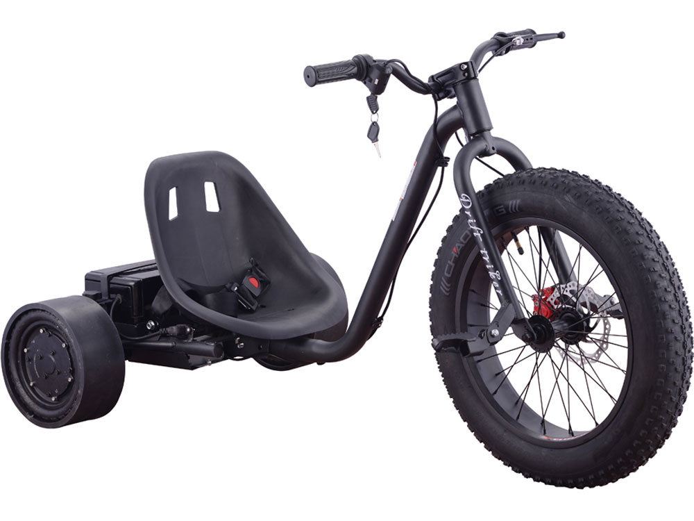 The New MotoTec DT900 Motorized Drift Trike delivers high power and speeds for the ultimate drifting ride. Powered by 2 hub motors in the rear wheels, 3 large 12v 12ah batteries and reaches speeds of 15 mph. Features include: large front tire, battery meter, key start, twist throttle, front disk brake, a bucket seat and easily changeable plastic disks around the rear tires. Featuring foot pegs  pedals!
