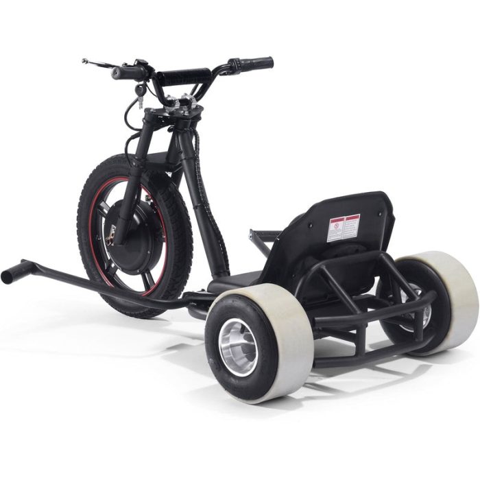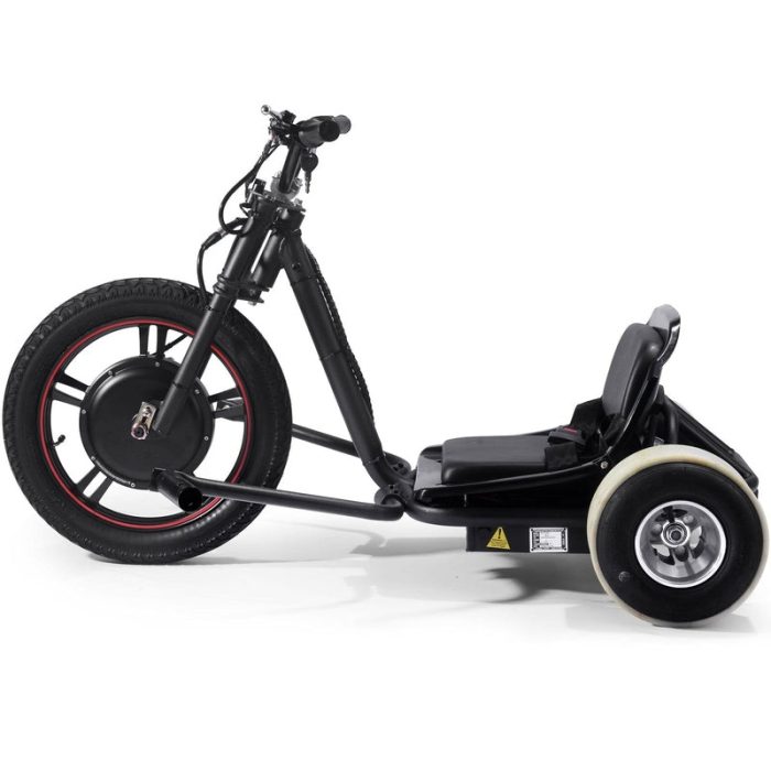 This trike delivers high power and speeds for the ultimate drifting ride. Having a front powered wheel allows the rider to hold precise drifts versus a rear powered model. The front wheel uses an 800w 48v hub motor with a 48v 17.5ah Lithium Battery and reaches speeds of 25 mph. It includes long comfortable foot rests, front hydraulic disk brake, adjustable handle bars, a seat that folds down and easy changeable sliding plastic disks around the rear tires.