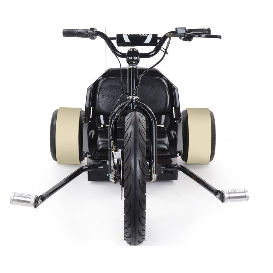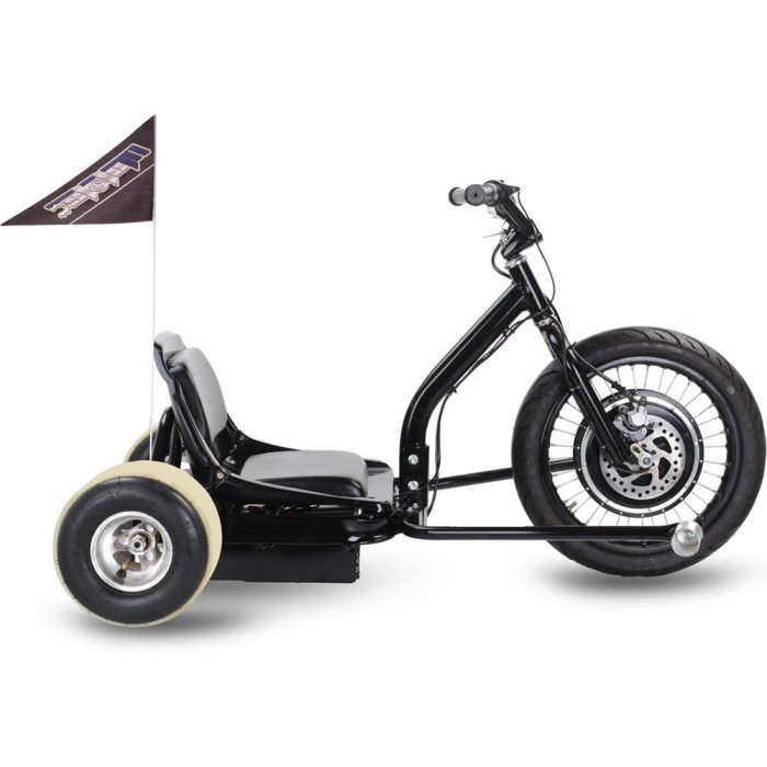 The new MotoTec Motorized Drifter Trike delivers high power and speeds for the ultimate drifting ride. Having a front powered wheel allows the rider to hold precise drifts versus a rear powered model. The front wheel uses a 500w 48v hub motor with 4 large 12v 12ah batteries and reaches speeds of a high mph. It includes long comfortable foot rests, front hydraulic disk brake, adjustable handle bars, a seat that folds down and easily changeable plastic disks around the rear tires. Featuring foot peg pedals!