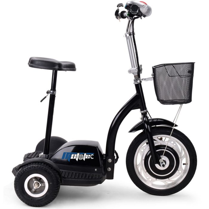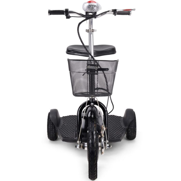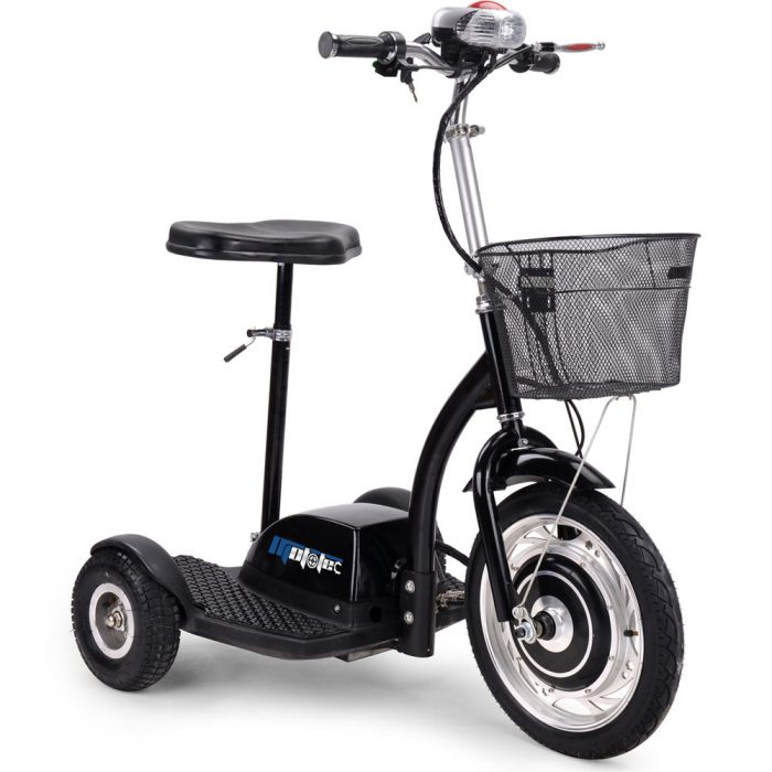 The MotoTec Electric Powered Trike aka Personal Transporter is a three wheel electric scooter that you can ride while sitting or standing, this makes it very convenient for use at events, security and warehouse floor operations or for just plain fun! It’s like a three wheel Segway but at a fraction of the price! Powered by a 350 watt front wheel hub motor with speeds of 15 miles per hour. It can achieve a 20 plus mile range on a full charge. It features a 16″ pneumatic front tire, two 4″ pneumatic rear tires and a removable seat. This personal transporter is easy-to-operate with a twist throttle and left handle front drum brake system. Comes standard with key, battery meter light, front LED head light and carrying basket.