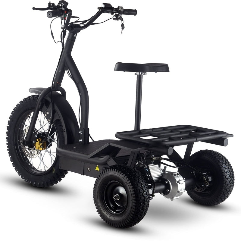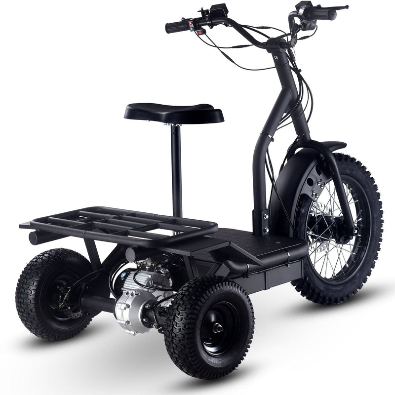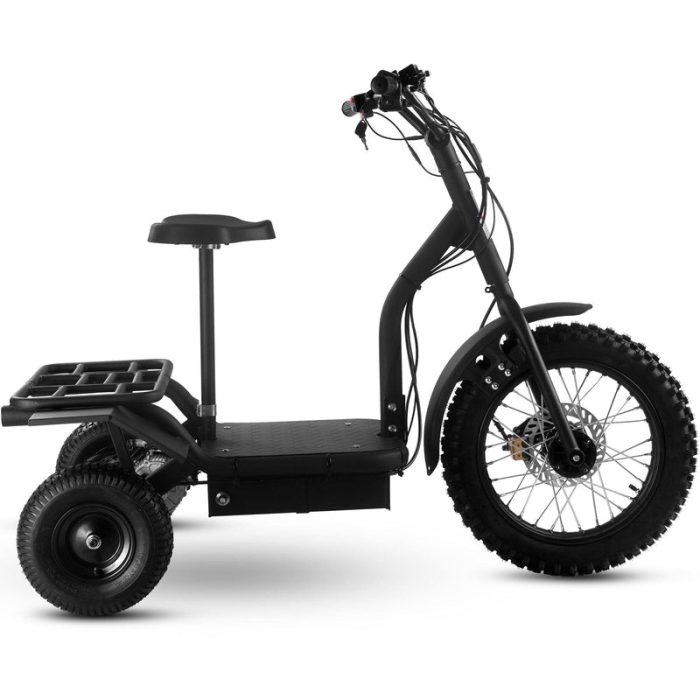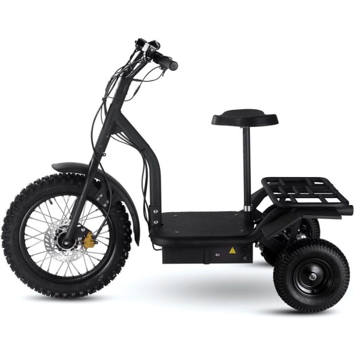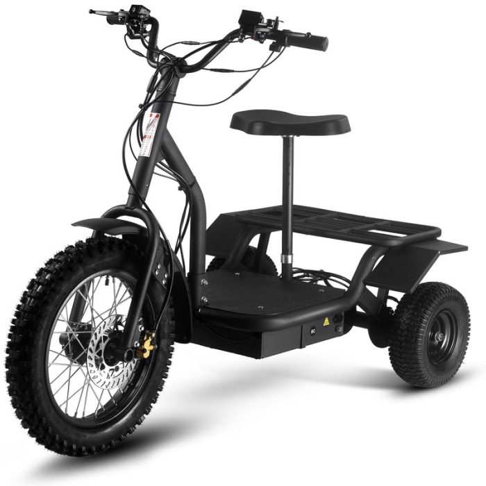 This a torque monster ready to conquer any terrain! This is a three wheel electric scooter that you can ride while sitting or standing, this makes it very convenient for use at events, security and warehouse floor operations or for just plain fun! It’s like a three wheel Segway but at a fraction of the price! Powered by a 1200 watt servo motor with speeds up to 15 miles per hour. It can achieve a 20+ mile range on a full charge. It features a 24″ pneumatic front tire, two 12″ pneumatic rear tires and a removable seat. This personal transporter is easy-to-operate with a twist throttle and front/rear hydraulic brake system. Comes standard with key, battery meter lights, reverse and carrying rack.