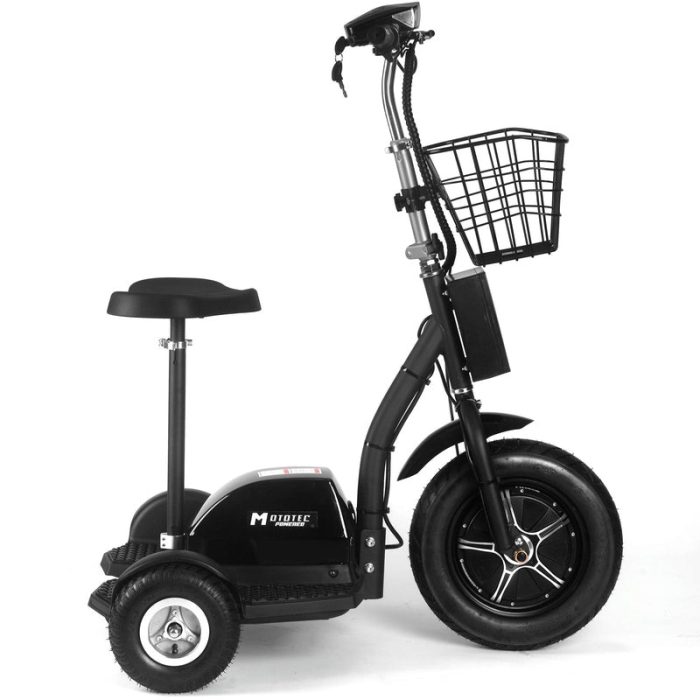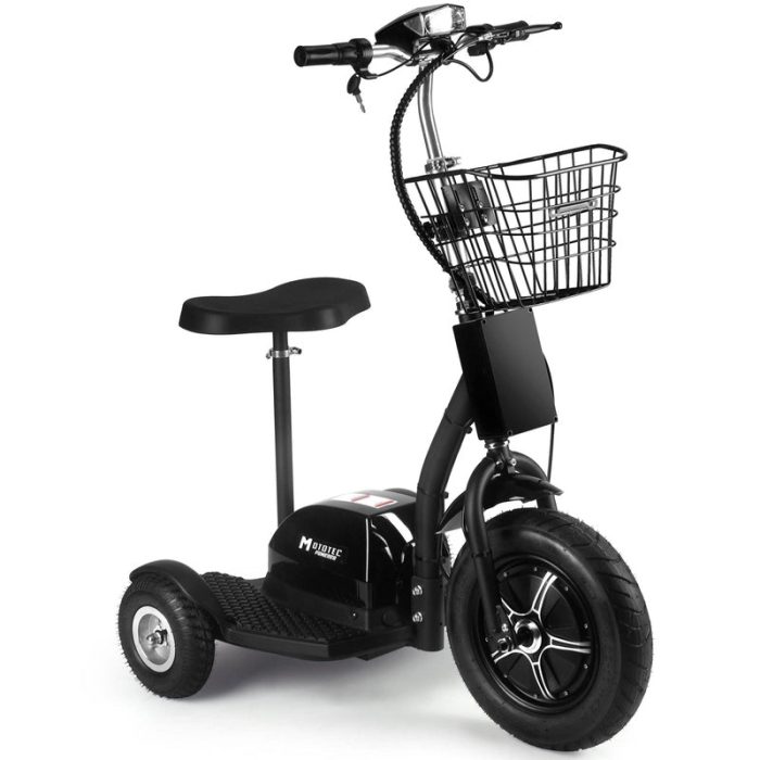 It’s a three-wheel electric scooter that you can ride while sitting or standing, this makes it very convenient for use at events, security and warehouse floor operations or for just plain fun! It’s like a three wheel Segway but at a fraction of the price! Powered by a 500 watt front wheel hub motor with speeds of 22 miles per hour. It can achieve a 20 plus mile range on a full charge. It features a 16″ pneumatic front tire, two 9″ pneumatic rear tires and a removable seat. This personal transporter is easy-to-operate with a twist throttle and left handle front drum brake system. Comes standard with key, battery meter light, front LED head light and carrying basket.