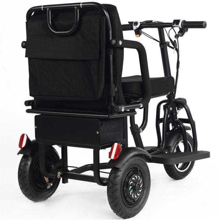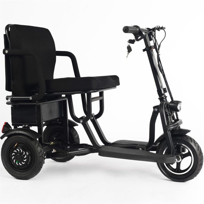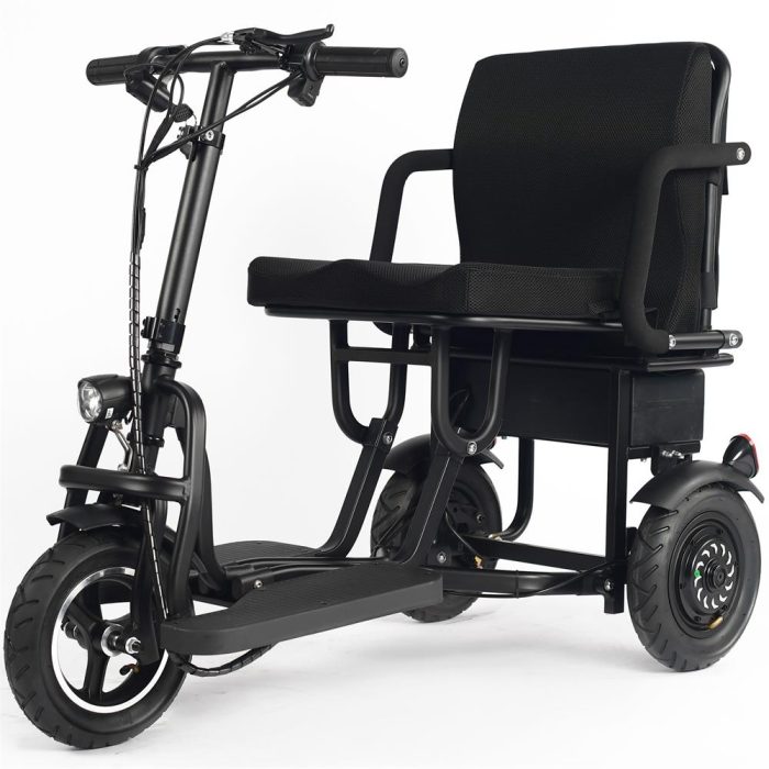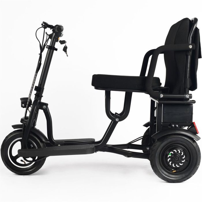 Introducing the new Folding Mobility Scooter by MotoTec. Its compact, three wheel styling makes for a sharp turning radius, 2 hub motors built into the rear wheels provide amazing torque for riding up inclines with its lightweight durable frame made from Aluminum. The lithium battery is lightweight and lasts longer than your standard lead acid competing models. Comes standard with headlight, rear reflectors, key start, reverse, dual rear drum brakes, comfortable seat with backrest, carrying bag and large 10 inch air filled tires to provide a comfortable ride.