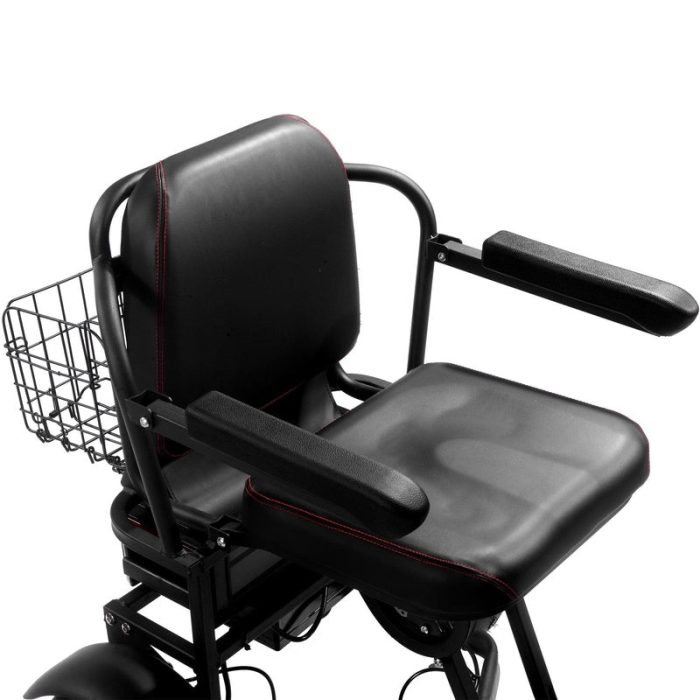 Its compact, three wheel styling makes for a sharp turning radius, 2 hub motors built into the rear wheels provide amazing torque for riding up inclines with its light weight durable frame made from Aluminum. The lithium battery is light weight and lasts longer than your standard competing lead acid models. Comes standard with headlight, rear light, key start, 3 forward speeds(with additional slow 2mph store speed), reverse, dual rear disk brakes, comfortable seat with arm rests and backrest, front & rear baskets and large 11 inch air filled tires to provide a comfortable ride.