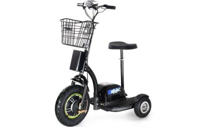 Introducing the new 1000 watt Folding Mobility Scooter by MotoTec. Its compact, three wheel styling makes for a sharp turning radius, 2 hub motors built into the rear wheels provide amazing torque for riding up inclines with its light weight durable frame made from Aluminum. The lithium battery is light weight and lasts longer than your standard competing lead acid models. Comes standard with headlight, rear light, key start, 3 forward speeds(with additional slow 2mph store speed), reverse, dual rear disk brakes, comfortable seat with arm rests and backrest, front & rear baskets and large 11 inch air filled tires to provide a comfortable ride.