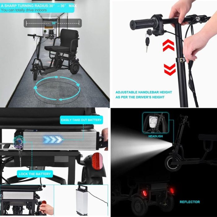 Its compact, three wheel styling makes for a sharp turning radius, 2 hub motors built into the rear wheels provide amazing torque for riding up inclines with its light weight durable frame made from Aluminum. The lithium battery is light weight and lasts longer than your standard competing lead acid models. Comes standard with headlight, rear lights, key start, 3 forward speeds(with additional slow 1.5mph store speed), reverse, dual rear drum brakes, comfortable seat with backrest, front & rear baskets and large 10 inch air filled tires to provide a comfortable ride.