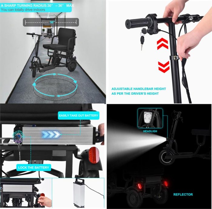 Introducing the new Folding Mobility Scooter by MotoTec. Its compact, three wheel styling makes for a sharp turning radius, 2 hub motors built into the rear wheels provide amazing torque for riding up inclines with its light weight durable frame made from Aluminum. The lithium battery is light weight and lasts longer than your standard competing lead acid models. Comes standard with headlight, rear lights, key start, 3 forward speeds(with additional slow 1.5mph store speed), reverse, dual rear drum brakes, comfortable seat with backrest, front & rear baskets and large 10 inch air filled tires to provide a comfortable ride.