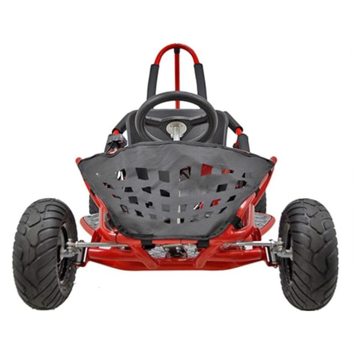 • Features a heavy-duty design with a tubular hi-tensile steel frame with a full overhead roll bar cage, padded areas beside the cockpit, and an adjustable bucket seat for the safety of the rider. Even the brake and throttle pedals are made of durable metal, so the MotoTec Off Road is rugged and built to last.