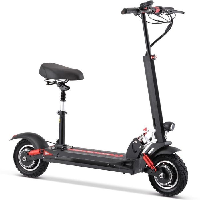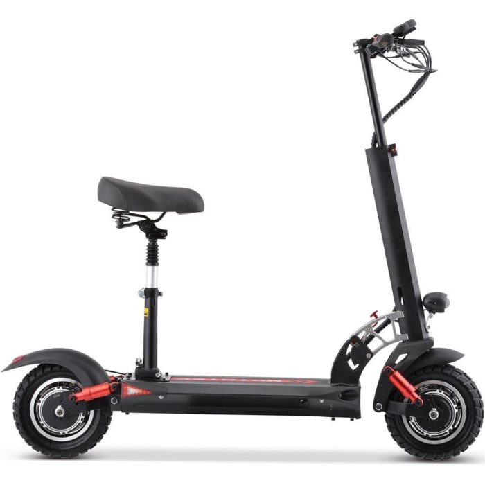 • Enjoy excellent comfort whether you ride it standing or sitting. The MotoTec Thor Scooter comes with a somewhat wide deck with a detachable padded mini-saddle so you can ride it in a sitting position. The deck is spacious and allows you to stand comfortably.