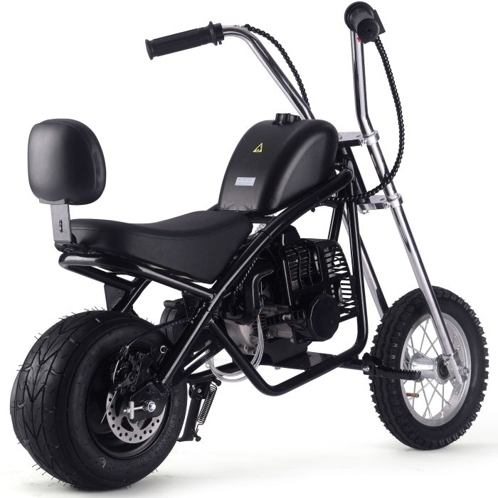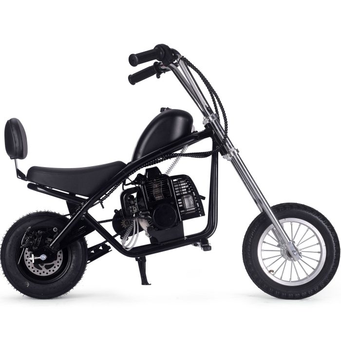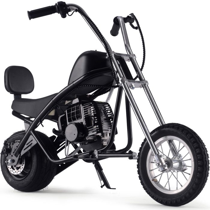 The MotoTec 49cc Gas Mini Chopper V2 is the ultimate kid ride! Great for driveway and parking lot fun, cruise around cones and speed through trails with ease. Comes standard with rear disk brakes and large 12 inch front and 9 inch rear pneumatic street tires.