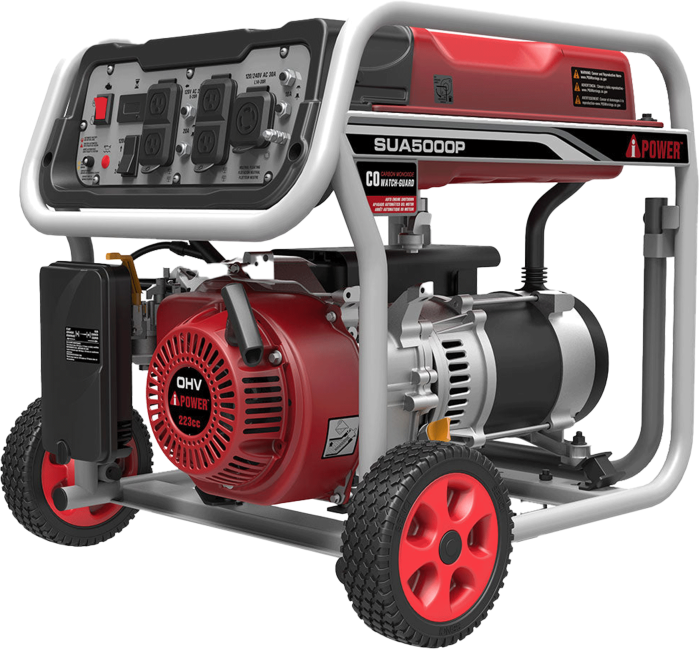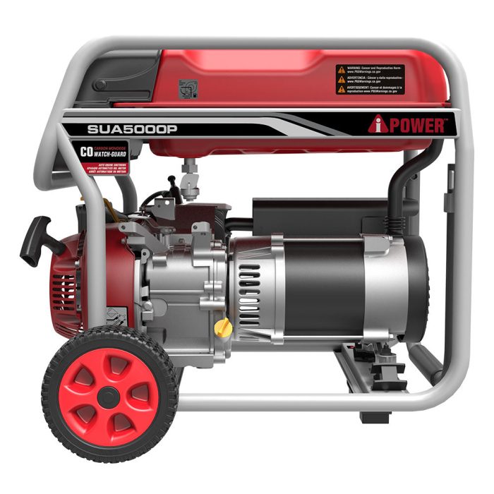 The A-iPower SUA5000P produces 5,000 starting watts with 4,250 running watts to power your tools at the construction site, camping ground, or household appliances. Its powerful 223 cc OHV 4 stroke engine comes with a low oil alert light and low oil automatic shutdown to keep your generator performing year after year. The large 4-gallon gasoline fuel tank provides an average run time of 13 hours at 25% load. Featuring a CO2 sensor, the generator automatically shuts down when carbon monoxide is detected. Built in portability with folding handle, rugged wheels and a durable powder coated metal frame to successfully meet your transportation demands.