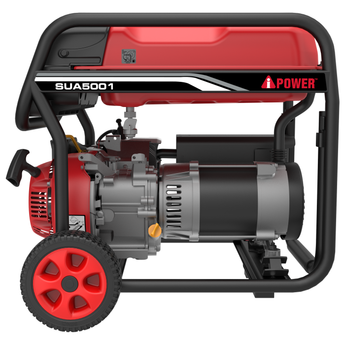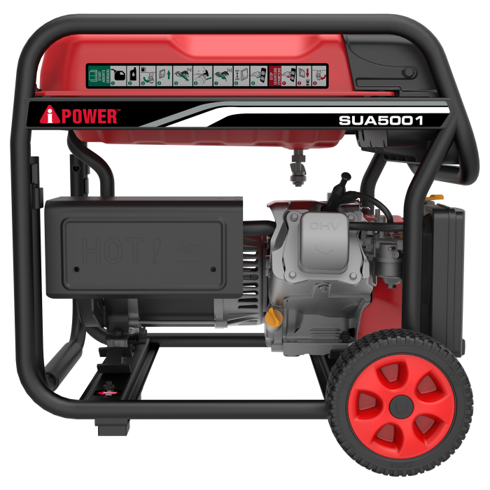 The A-iPower SUA5001 5000-Watt Generator has a performance series 223cc OHV engine with a cast iron sleeve and low oil shutdown. Offering 5,000 starting watts, with 4,250 running watts, the unit’s four-gallon fuel tank offers an extended run time of 13 hours at 25% load.
