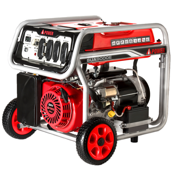 The A-iPower 9000E provides 9,000 watts of starting power and 7,250 watts of running power. It’s well-suited for the construction job site or as backup power for your home during emergencies. The generator features an electric start – battery included.