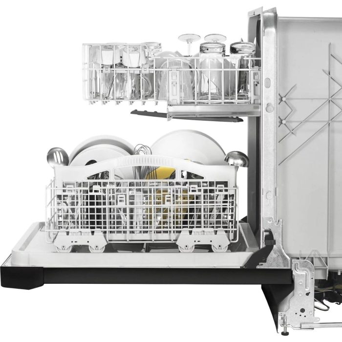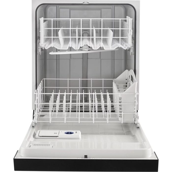 Amperage (amps) 10 A Appliance Category Dishwasher Appliance Type Dishwasher Color/Finish Black Color/Finish Family Black Control Location Front Control Control Type Electronic Custom Door Panel Ready No Decibel (Sound) Rating 55 dBA Delay Start Option Yes Dishwasher Features Automatic Temperature Control, Filtered Water, Hard Food Filter, Sound Reduction System Dishwasher Rack Configuration 1st Rack- Silverware Basket, Cup Shelf Dishwasher Wash Cycles Delay Start, High Temperature Wash, Quick Wash, Standard Wash Dry Options Heated Dry Energy Consumption (kWh/year) 270 Energy Efficiency Tier Rating Tier I Handle Type Pocket Handle Hose Length (ft.) 6 ft Number of Cycles 3 Number of Place Settings 13 Product Weight (lb.) 55 lb Rack Material Vinyl Returnable Non-Returnable Silverware Basket Location In Rack Sound Rating Range (Decibels) Quiet Steam Function Without Steam Tub Material Plastic Tub Voltage (volts) 60 V Warranty / Certifications